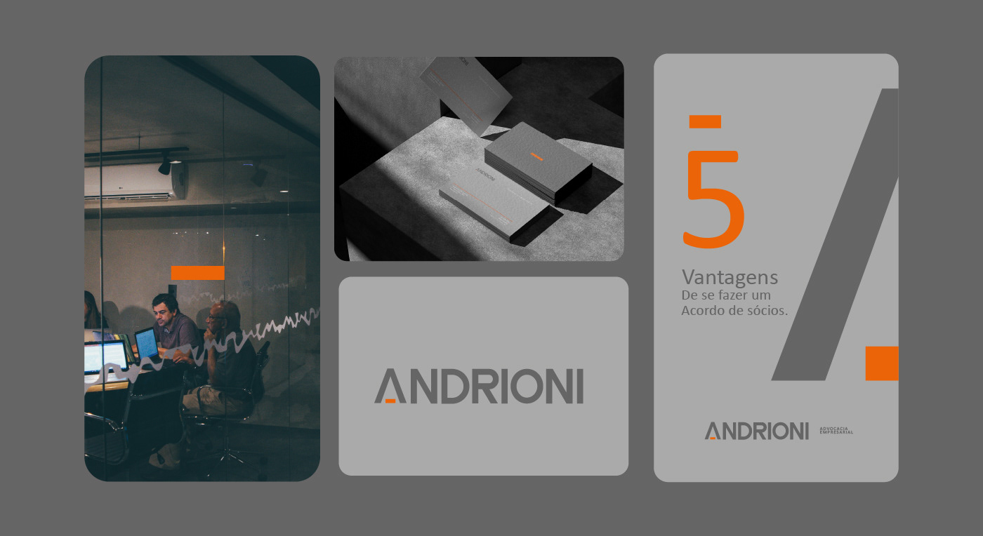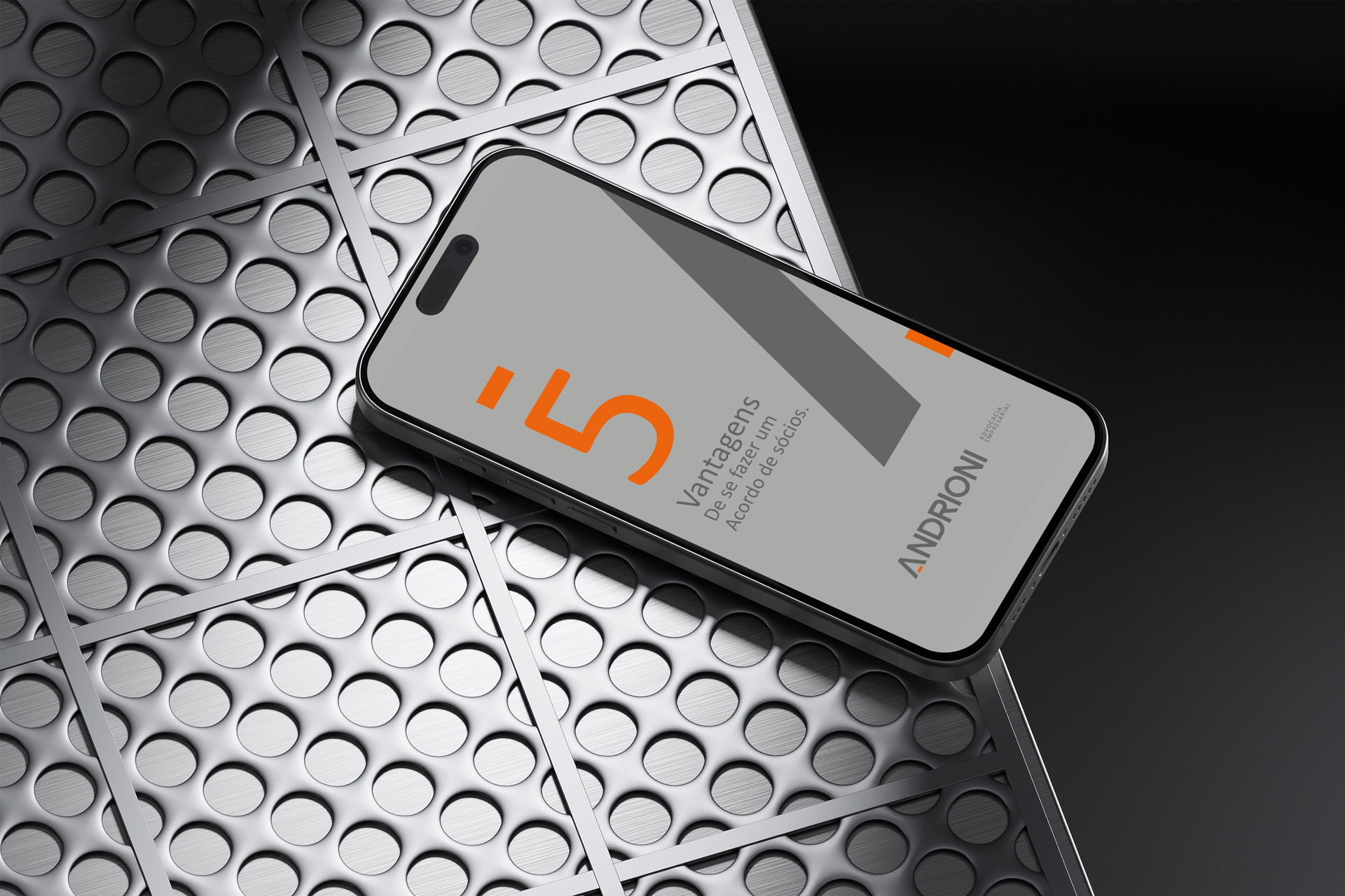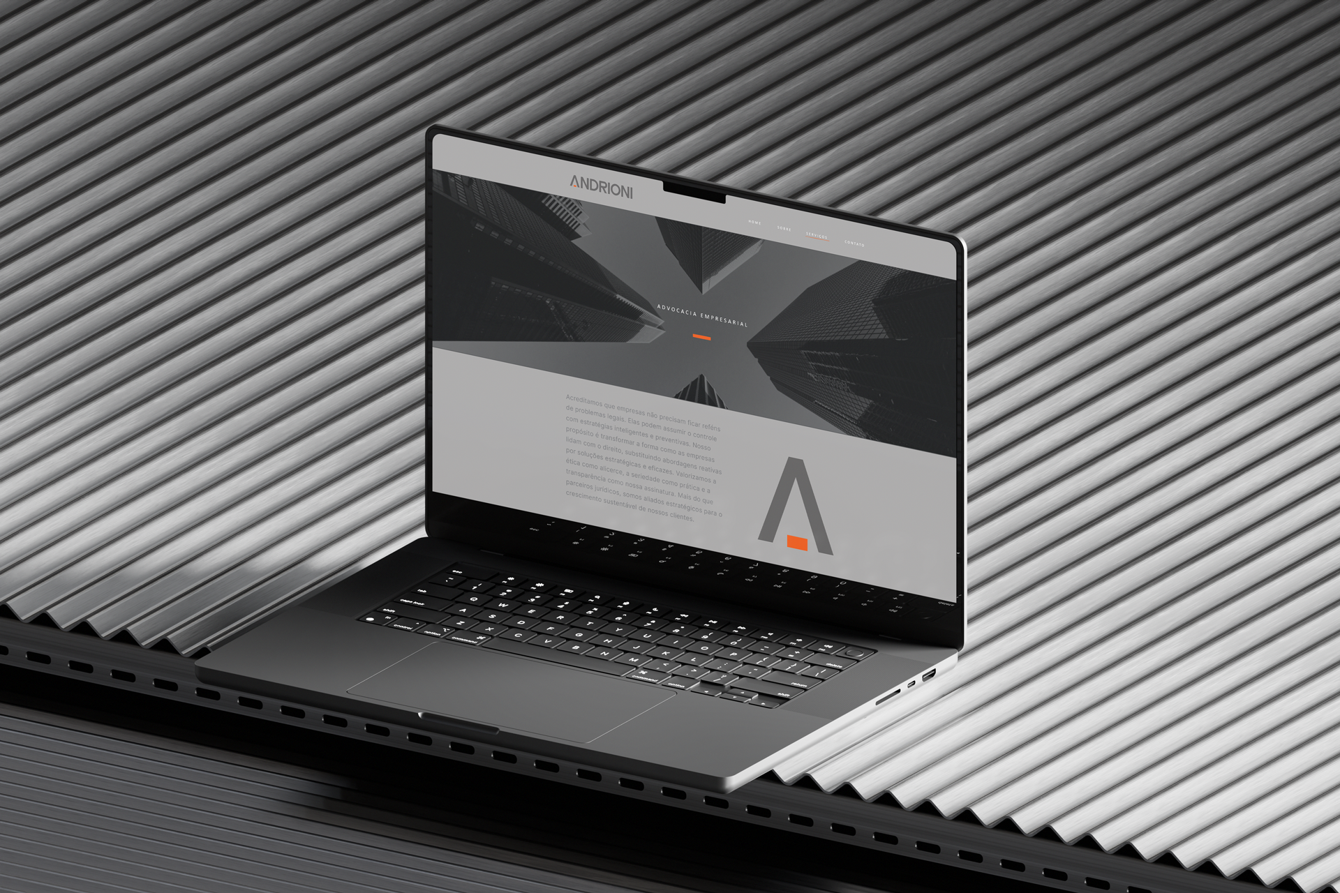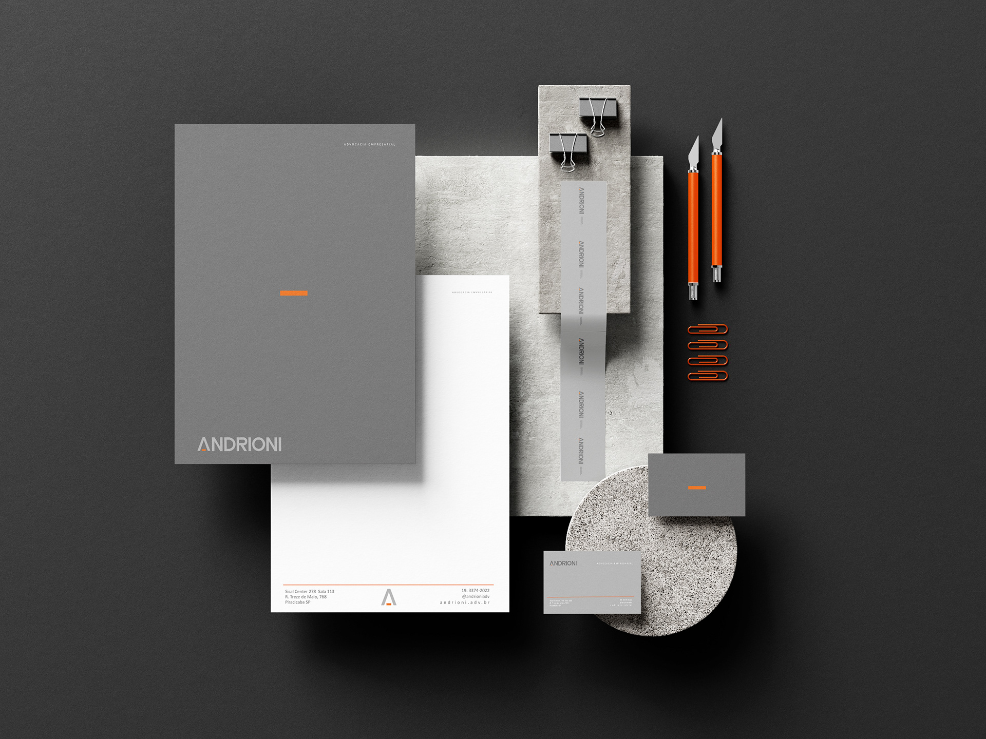 Brand redesign and visual identity for the law firm Vinicius Andrioni, now Andrioni Advocacia Empresarial. The new logo is typographic, with a modern sans serif font that conveys confidence and stability. Its clean design reinforces the professionalism and clarity of the brand, while the orange detail at the foot of the “A” adds dynamism and strategic anticipation, contrasting with the gray tones that convey solidity and sophistication. A visual identity that combines modernity and authority, positioning Andrioni as a reference in the business world.