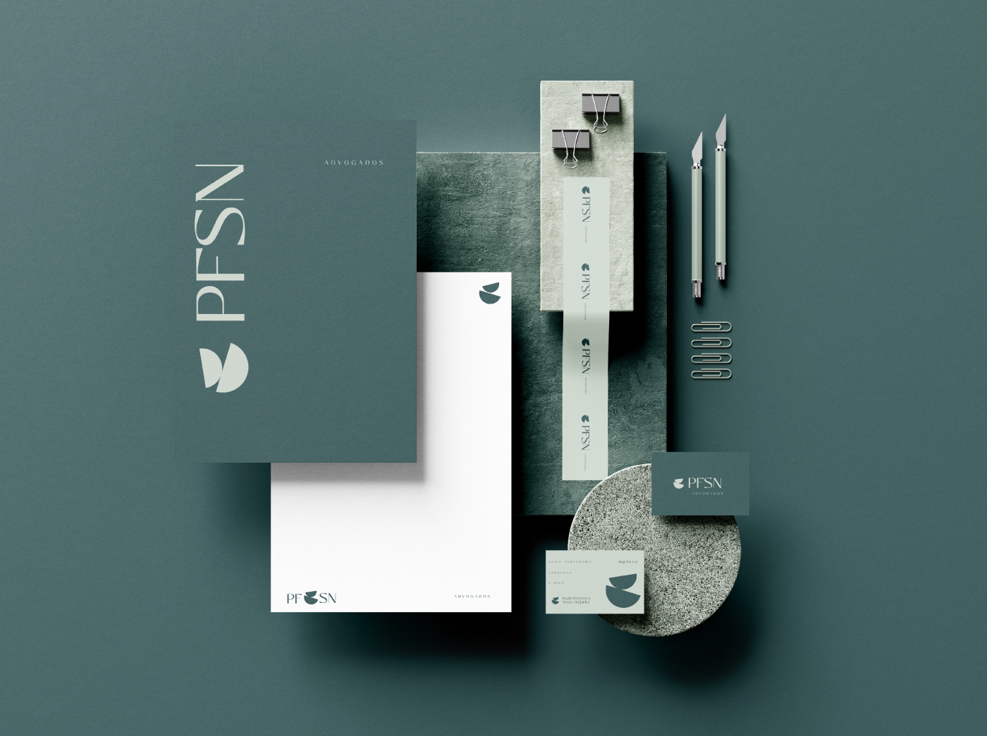 Brand and visual identity project developed for Pupin Ferreira e Souza Nogueira Sociedade de Advogados. The logo conveys a contemporary vision of law by balancing sobriety, precision, and humanity in a simple and consistent visual solution. The organic and complementary forms symbolize the union between reason and sensitivity, translating the idea of justice applied with technical rigor, ethics, and empathy. The identity is supported by a solid, elegant, and timeless visual system that reinforces trust, clarity, and professionalism, without sacrificing an accessible and human language.